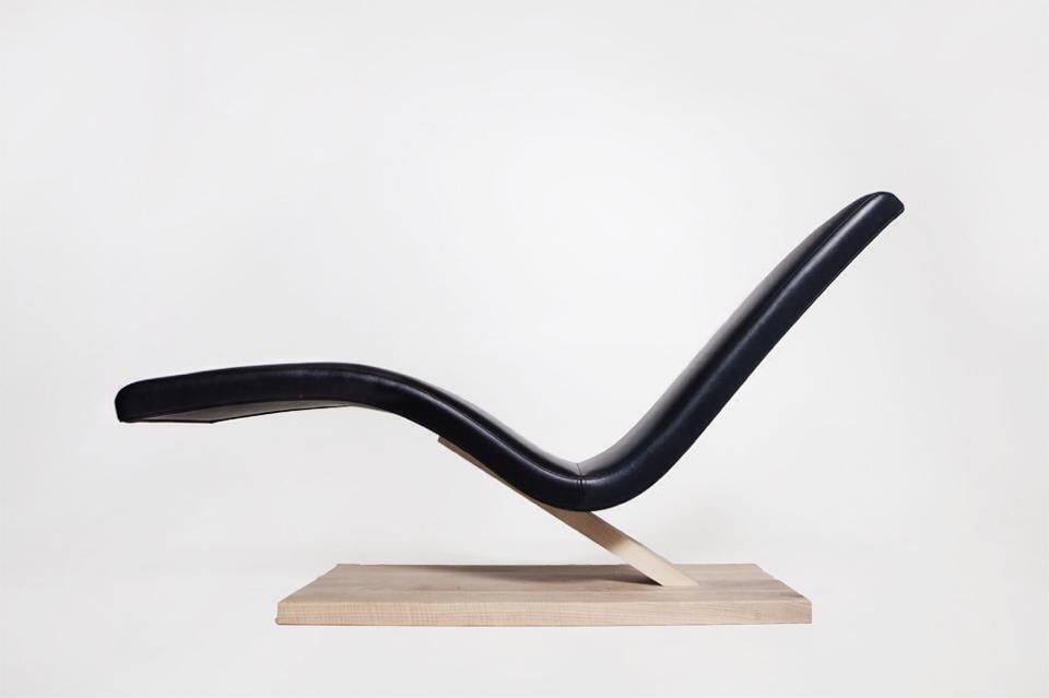 The lounge chair is made in American Ash. The goal with this chair was to give it a sense of weightlessness and the look as if it's floating from a distance. The chair is upholstered in black vinyl leather but that can be changed per your request. The chair is very strong and you can actually stand on the end. Please note that this item is a made to order so please allow a couple weeks for delivery